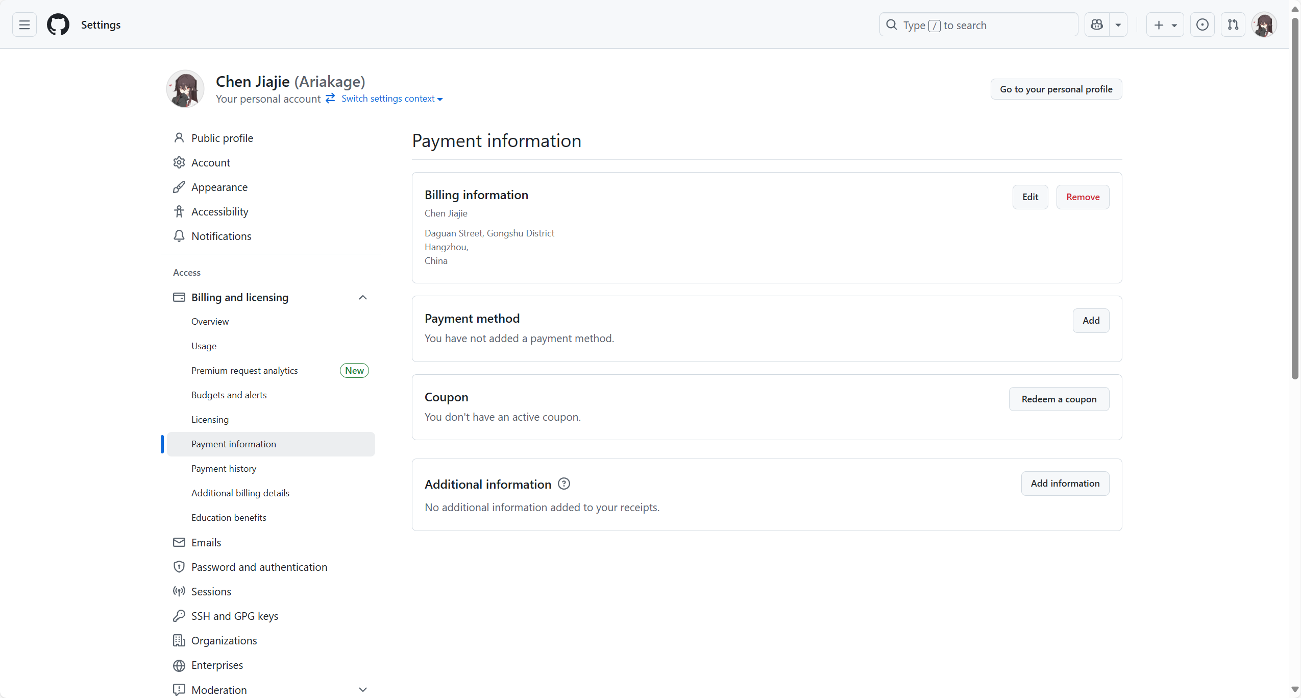 接下来点击侧栏中Access下的Billing and licensing,进入展开项里面的Payment information